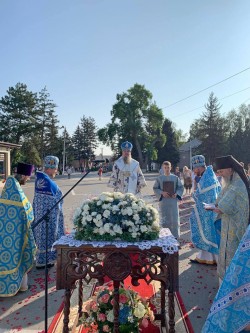 Престол для служения литургии был поставлен перед находящейся в центре города часовней в честь чтимого образа Пресвятой Богородицы «Троеручица». Там же разместили икону с частицей святых мощей уроженца Приднестровья сщмч. Николая, пресвитера Елисаветградского, посещающую приходы епархии в рамках празднования юбилея епархии.