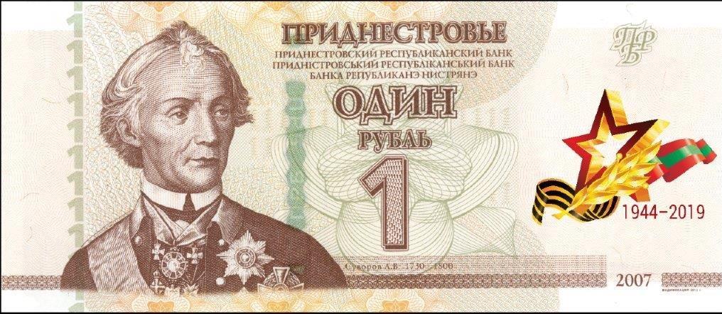 С 12 апреля 2019 года в обращение вводятся памятные банкноты номиналом 1 рубль «75 лет со дня освобождения левобережного Приднестровья от немецко-фашистских захватчиков». Памятная банкнота имеет формат и дизайн, аналогичный банкноте модификации 2012 года соответствующего номинала, с нанесением в правом поле лицевой стороны специальной маркировки с изображением звезды, лавровой ветви, расходящимися в стороны лентой в цветах флага Приднестровской Молдавской Республики и георгиевской лентой, а также надписью «1944-2019». Тираж памятных банкнот составляет 1 500 штук. Банкноты упакованы в буклеты. Памятные банкноты Приднестровского республиканского банка «75 лет со дня освобождения левобережного Приднестровья от немецко-фашистских захватчиков» являются законным средством обращения и платежа на территории Приднестровской Молдавской Республики, обязательны к приему по нарицательной стоимости во все виды платежей всеми организациями независимо от формы собственности и сферы деятельности.