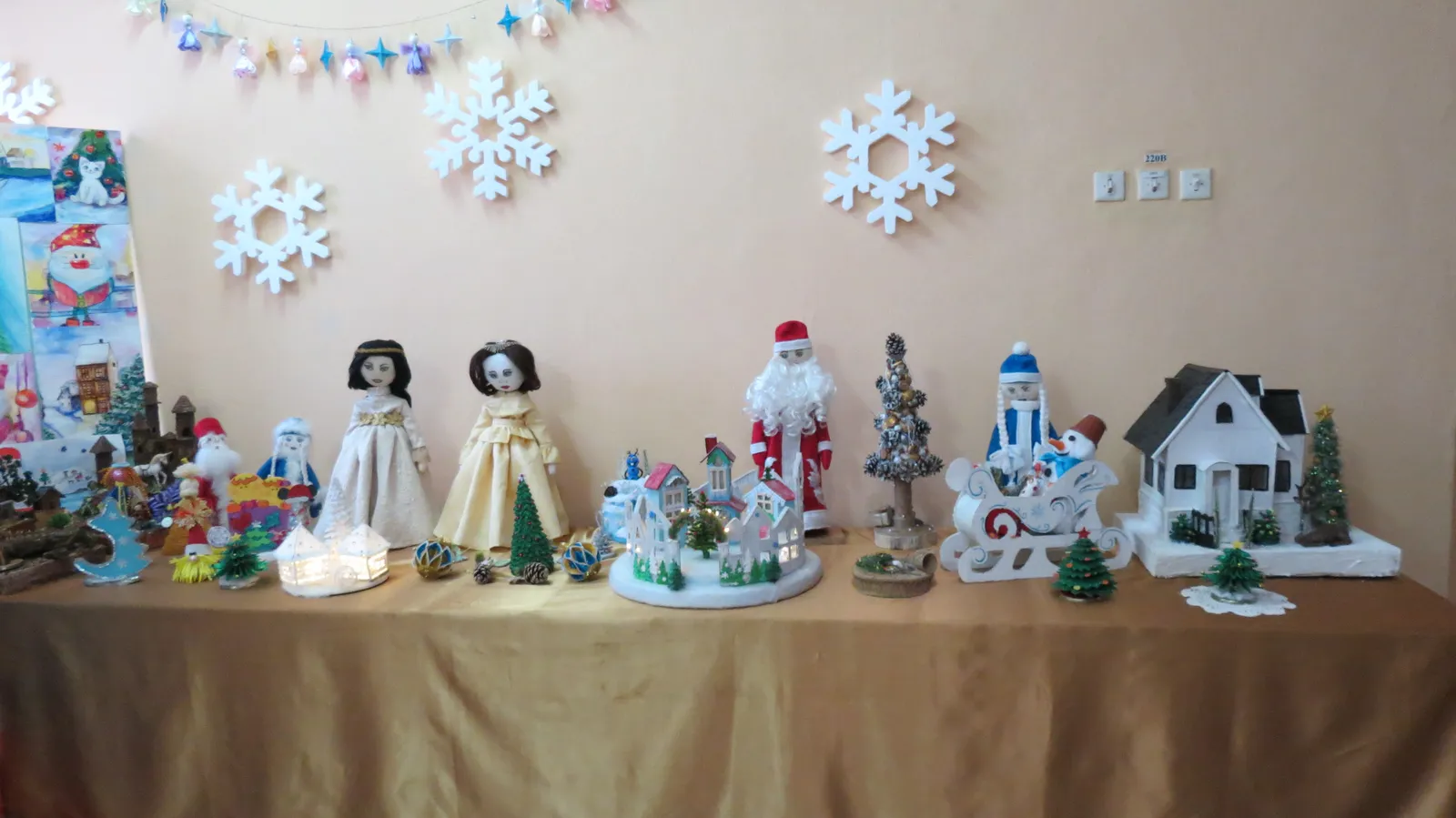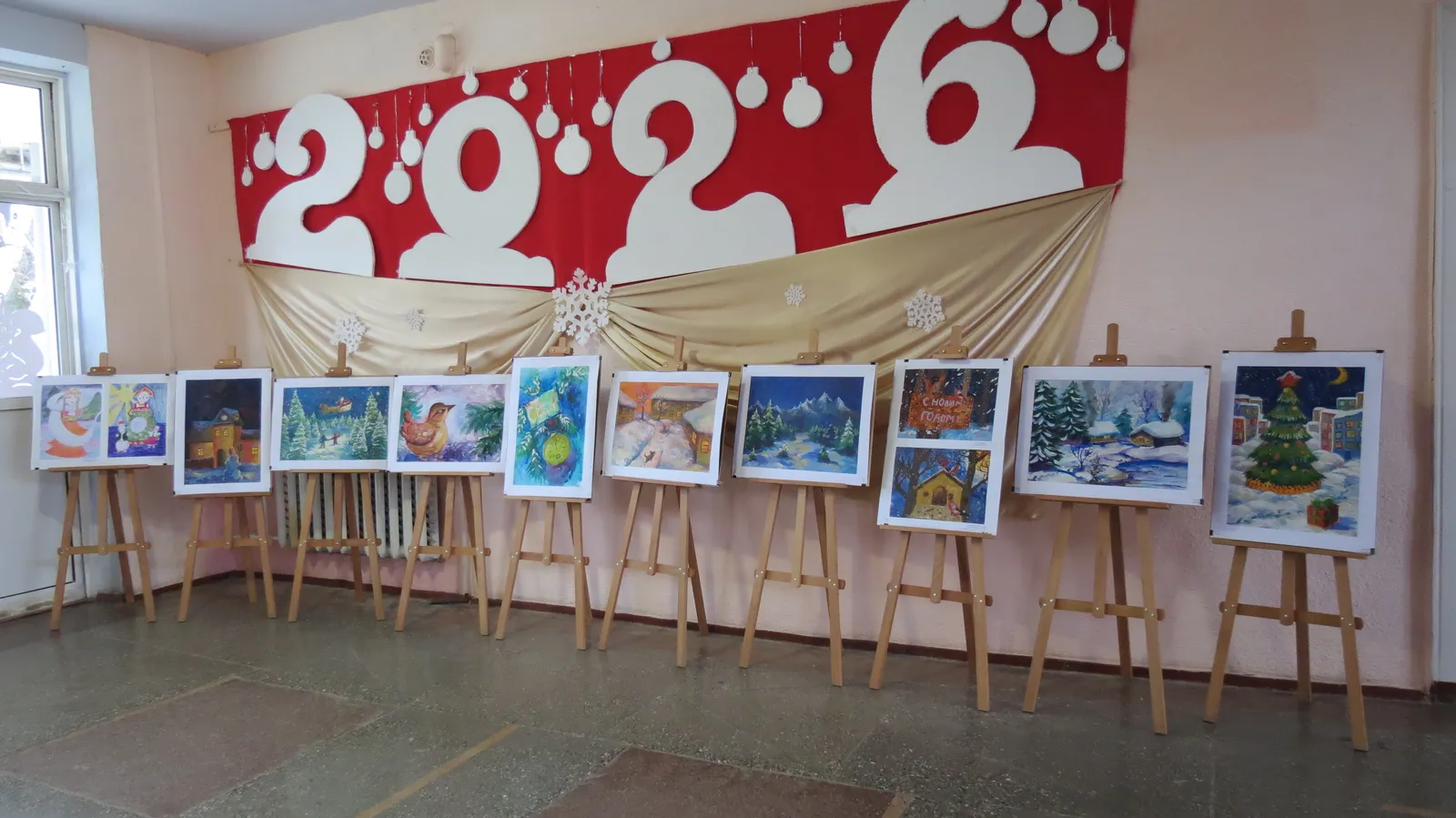 В холле гостей встречала праздничная фотозона с тантамаресками, а также выставка работ учащихся школы искусств – рисунков, поделок и изделий из глины.